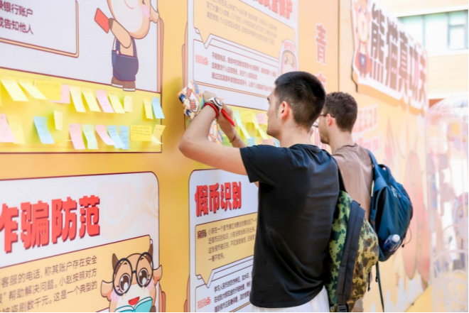 为了提高活动的趣味性,让消保知识深入人心,工行北京分行在活动现场还设置了“消保大转盘”“熊猫真功夫”等打卡盖章环节,邀请学生们参与消保知识有奖问答,击打“诈骗沙袋”,提示过往师生警惕“征信修复”“套路贷”“网络游戏虚假交易”等陷阱。工行北京分行消保IP形象“工小宝”在现场也广受师生喜爱,大家纷纷与之互动合影,并持消保标语在现场的打卡背板拍照留念。不少师生对本次活动给出了积极反馈,表示自己收获颇丰,并在主题展板上,用便利贴留下了个人心得。