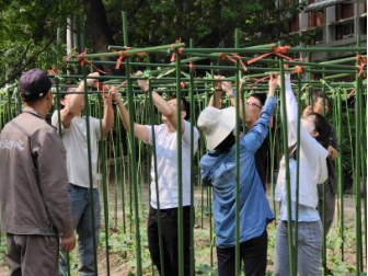 为了给黄瓜苗们的生长发育创造良好的条件,5月10日,利用工作间隙,财务处五名同志率先到达花房,为菜园做搭架子、绑苗等工作。短短两周,经过花房师傅辛勤的培育和几场大雨的洗礼,菜苗儿长高了不少,整个菜园焕发了勃勃生机,期待每一株黄瓜苗都能茁壮成长。